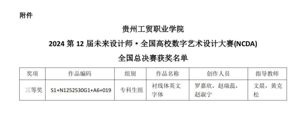 在这场汇聚了全国高校精英的盛会中,由艺术学院专任教师文晨、黄克松指导,学生罗嘉欣、赵瑞蕊、赵淑宁的创作作品《衬线体英文字体》,凭借扎实的专业素养和非凡的创意才华,在众多强劲对手中脱颖而出,荣获全国总决赛三等奖!