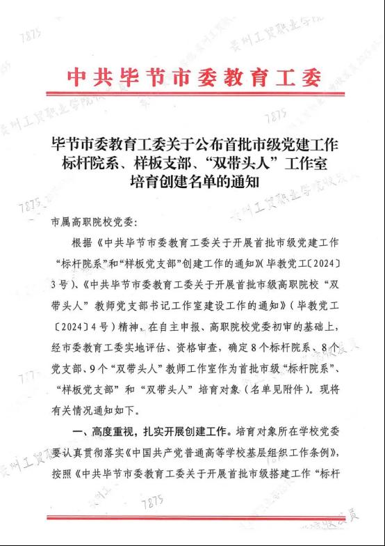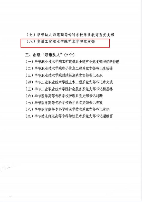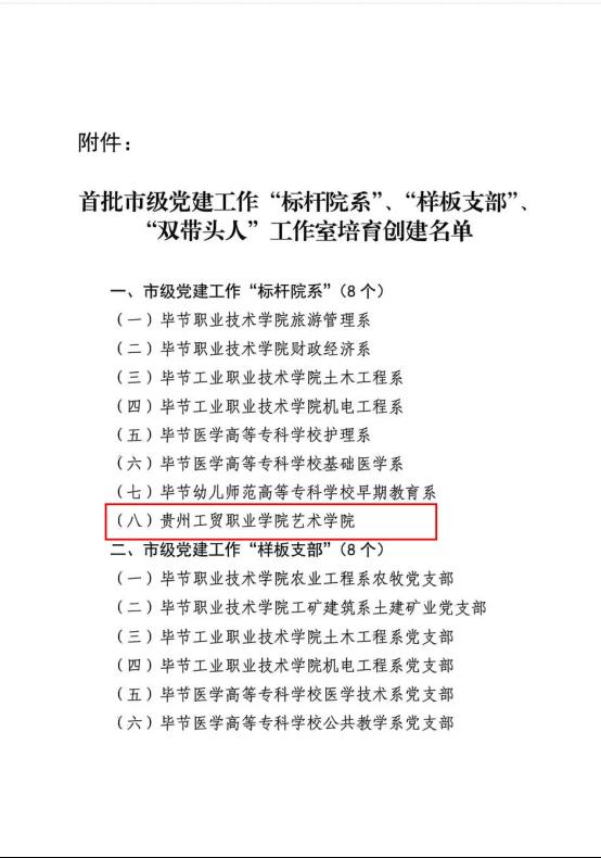 近日,中共毕节市委教育工委公布首批市级党建工作标杆院系、样板支部及“双带头人”工作室培育创建单位名单,beat365官方网站艺术学院入选“标杆院系”培育创建单位、艺术学院党支部入选“样板支部”培育创建单位。