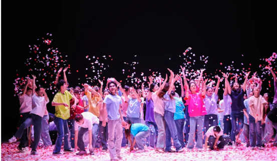 当舞台灯光再次聚焦,演出进入最动人的终章——《绽放·师恩难忘》。这一刻,聚光灯下的主角不再是技巧的展示,而是情感的奔涌与师道的传承。2023级舞蹈表演专业的全体学子与指导老师们走向舞台中央,师生同台,共同演出。这一刻,“绽放”不仅是舞蹈专业学生们技艺的成熟展现,更是师生情谊在舞台上的璀璨升华。