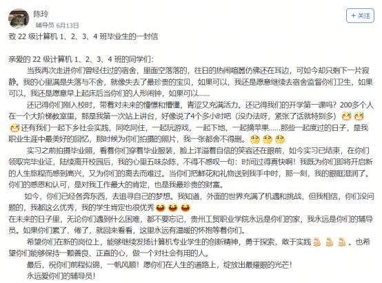 辅导员陈玲老师走进空荡的宿舍楼,仿佛还在昨日的喧嚣中,字里行间满是对22级计算机专业1、2、3、4班孩子们的回忆与“如果可以……”的无限怅惘。她珍藏的三下乡实践等照片、学生实习归来领取毕业证时的五味杂陈……,是无数工贸师生三年朝夕相处、亦师亦友情谊的生动缩影。