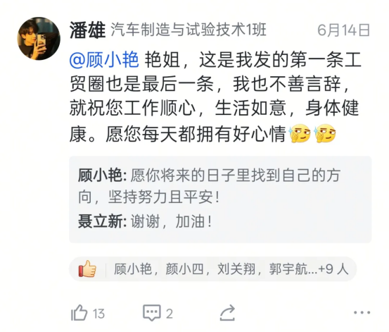 “艳姐,有缘再见!这是我发的第一条工贸圈也是最后一条,我也不善言辞,就祝您工作顺心,生活如意,身体健康。愿您每天都拥有好心情。”