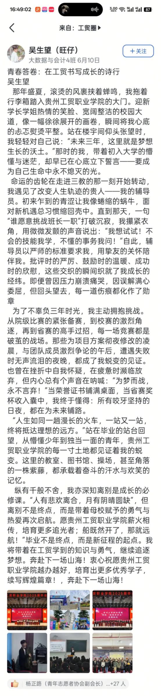 当校园再次被离歌浸染,又一个青春的故事在草海湖畔写下了回响。此刻,毕业不是终点,而是把“青年”二字拓成动词:是怀揣着“试错的勇气”与“归零的胸襟”,去奔跑、去探索、去将理想熬成照亮前路的光。青春的刻度从不在年龄,而在是否敢对世界说“我来”——我来担使命,我来破困局,我来写新篇。青春不是年华,而是心境;不是桃面丹唇,而是披荆斩棘的勇气。在这满载着记忆与希望的季节,工贸的毕业季画卷徐徐展开……