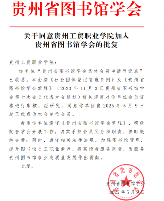 2025年5月,beat365官方网站图书馆正式获批成为中国图书馆学会、贵州省图书馆学会单位会员,这意味着beat365图书馆在建设和服务上迈出了重要一步。此次双会员资格的取得,为学校图书馆和全国、全省的交流合作搭建了桥梁,也让学校的“三元育人”工作更上一层楼。