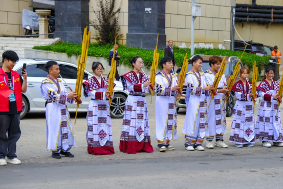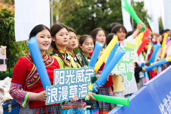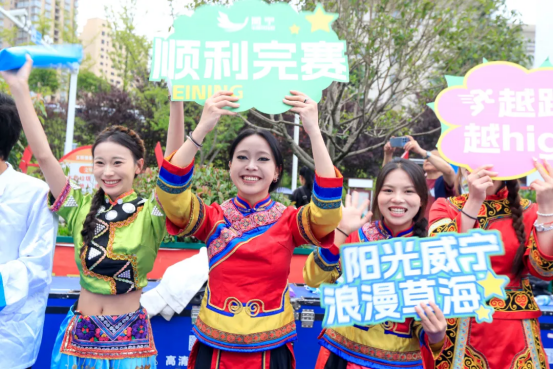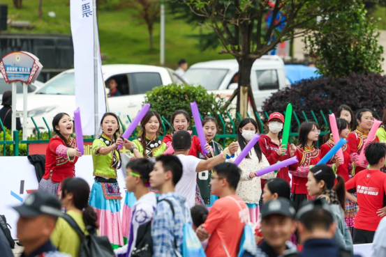 他们或身着民族盛装,或拉起横幅、手持应援板,或挥舞着加油棒,沿路为参赛选手们卖力加油鼓劲,直接把赛道变成狂欢现场。这边姑娘们的裙摆舞出彩虹残影,那边姑娘小伙们比赛般将加油声喊出回音。当选手们喘着粗气跑到近前时,拉拉队更是瞬间开启“人形喇叭”模式,“加油!”如同一剂强心针,催动着参赛者的步伐。
