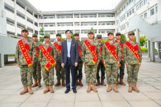 新兵欢送环节。校领导为即将奔赴军营的新兵们佩戴上光荣的大红花。这一刻,光荣与梦想交织,责任与使命同行,现场响起经久不息的热烈掌声,这是对学子们携笔从戎、保家卫国选择的最崇高敬意。