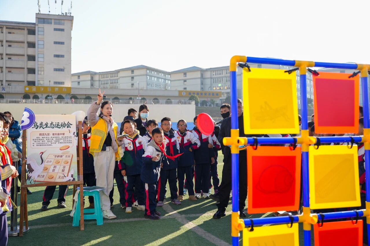 随后,“鸟类知识运动会”将气氛推向高潮。“飞鸟传书”环节考验着同学们的默契与知识储备,大家手舞足蹈地比划着“黑颈鹤”“草海”等词语,抢答声、欢笑声不绝于耳。“鹤舞连环”项目中,孩子们认真模仿学习传统健身术“五禽戏”中的“鸟戏”动作,在一招一式中体验传统文化的魅力,也体会着鸟类姿态的灵动。穿插进行的趣味知识问答,更让孩子们在轻松游戏中巩固了关于鸟类习性与保护的知识。