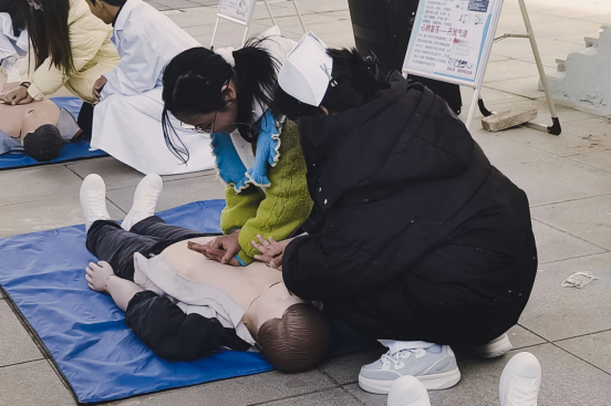 此次活动有学院的五名学生会康复协会成员为在活动现场的各位演练了心肺复苏、人工呼吸、气道异物解除等急救互救技能培训。现场气氛热烈学生们积极参与教学互动,康复协会成员演示结束后学生们争相实践,康复协会成员则为他们指导操作要领,纠正错误手法。
