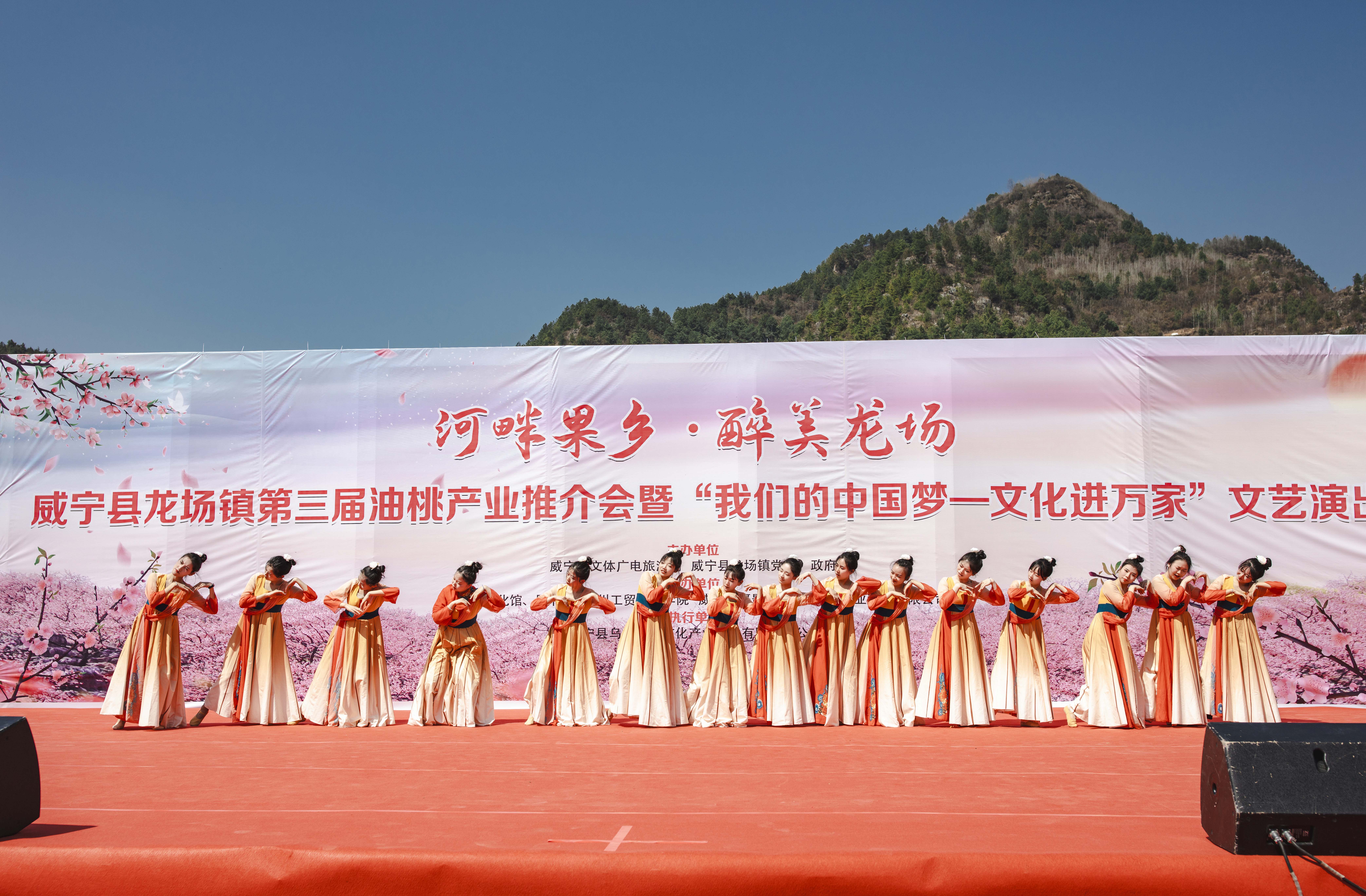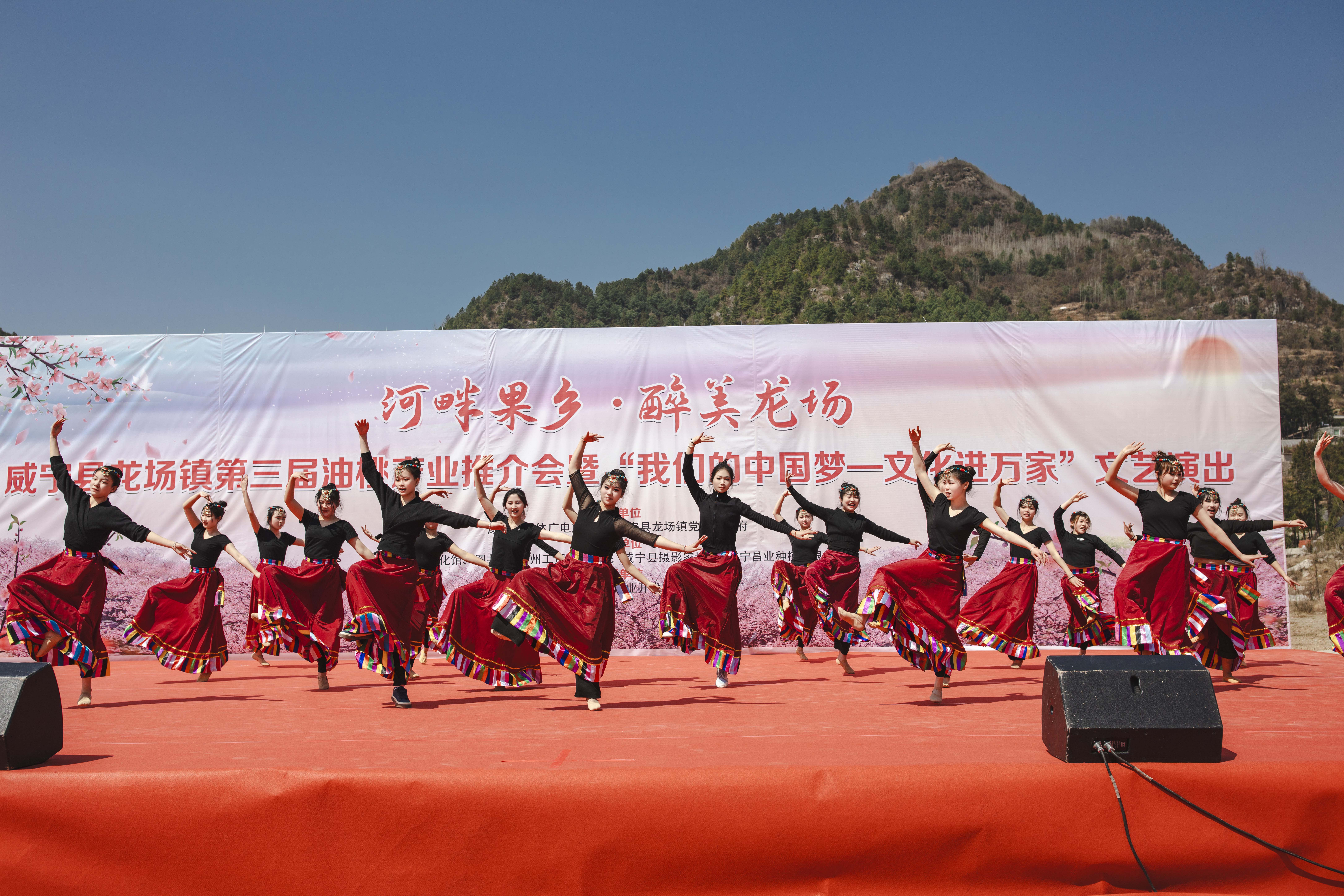 3 月 15 日,第三届油桃产业推进会暨“我们的中国梦——文化进万家”文艺演出在威宁县龙场镇举行,此次活动由威宁县文体广电旅游局、威宁县龙场镇党委、政府主办,beat365官方网站作为协办单位。此次推介会不仅是威宁县油桃产业发展的重要里程碑,也是beat365今年校企合作、服务地方的首个重要举措。活动现场,beat365官方网站艺术学院的学生们身着盛装,为广大群众打造一场精彩的视听盛宴。艺术学院带来了舞蹈《唐印》以其古朴典雅的风格,将观众带入了盛唐的繁华盛景;而《玛曲姑娘》则以其欢快的节奏和活泼的舞姿,展现了藏族少女的青春活力;《希望》则以深情的演绎,传递出对未来的美好憧憬;最后,舞蹈《堆谐》更是将现场气氛推向高潮,学生们用精湛的技艺和饱满的情绪,赢得了观众的阵阵掌声。