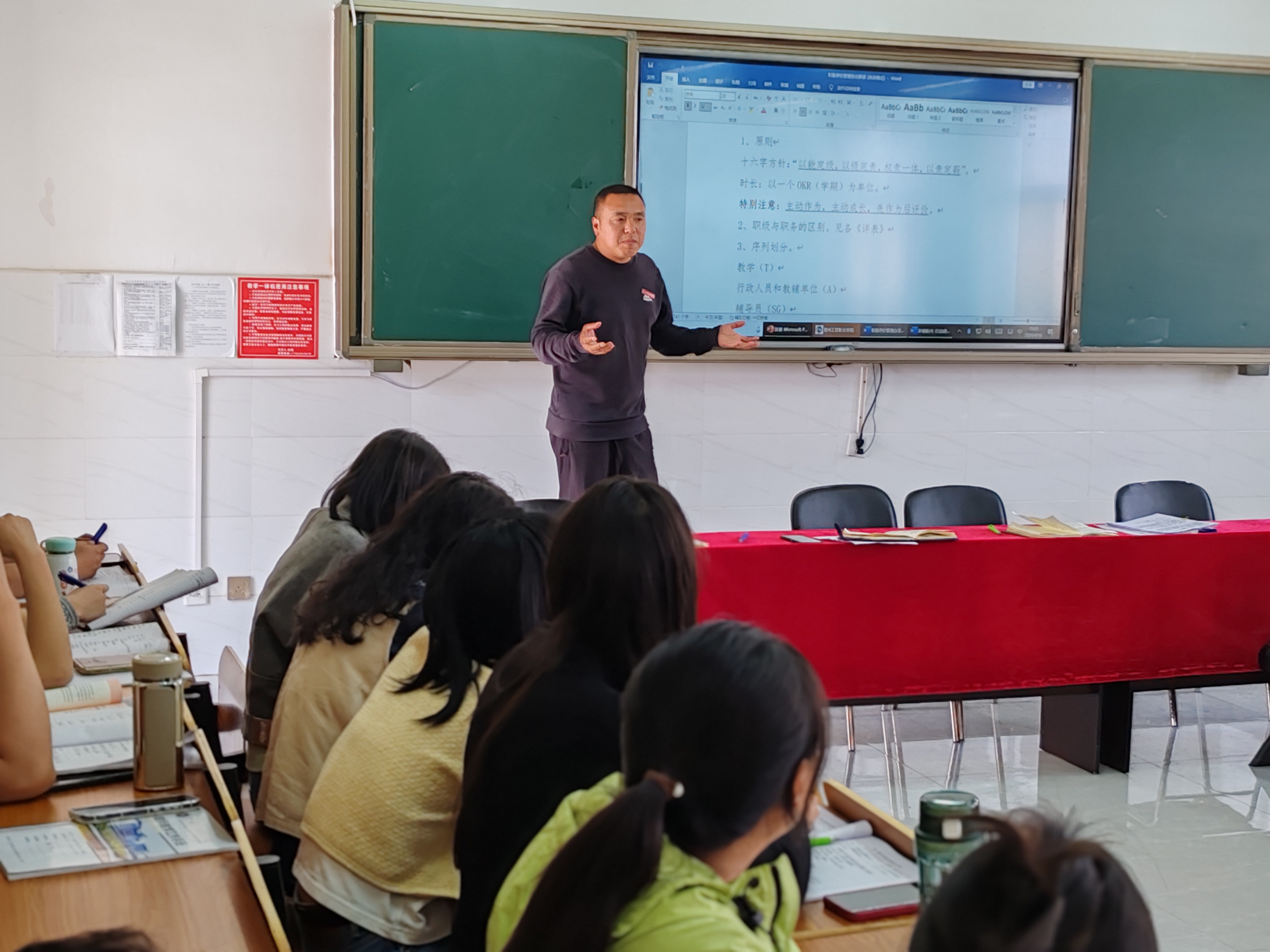 黄冠迪对教师教学级别在职级管理办法中的详细的解说,体现了职级制度在学校管理体系中的重要作用,以及职级与OKR(Objectives and Key Results,目标与关键成果)之间的紧密联系。首先,职级管理办法是教师职业发展的重要依据。它根据教师的教育教学能力、学术水平、工作经验等多方面因素,将教师划分为不同的级别。每个级别都有相应的职责、权限和待遇,这既是对教师工作的认可,也是对教师未来发展的激励。通过职级管理,学院可以更加科学、公正地评价教师的工作表现,为教师的职业发展提供有力的制度保障。