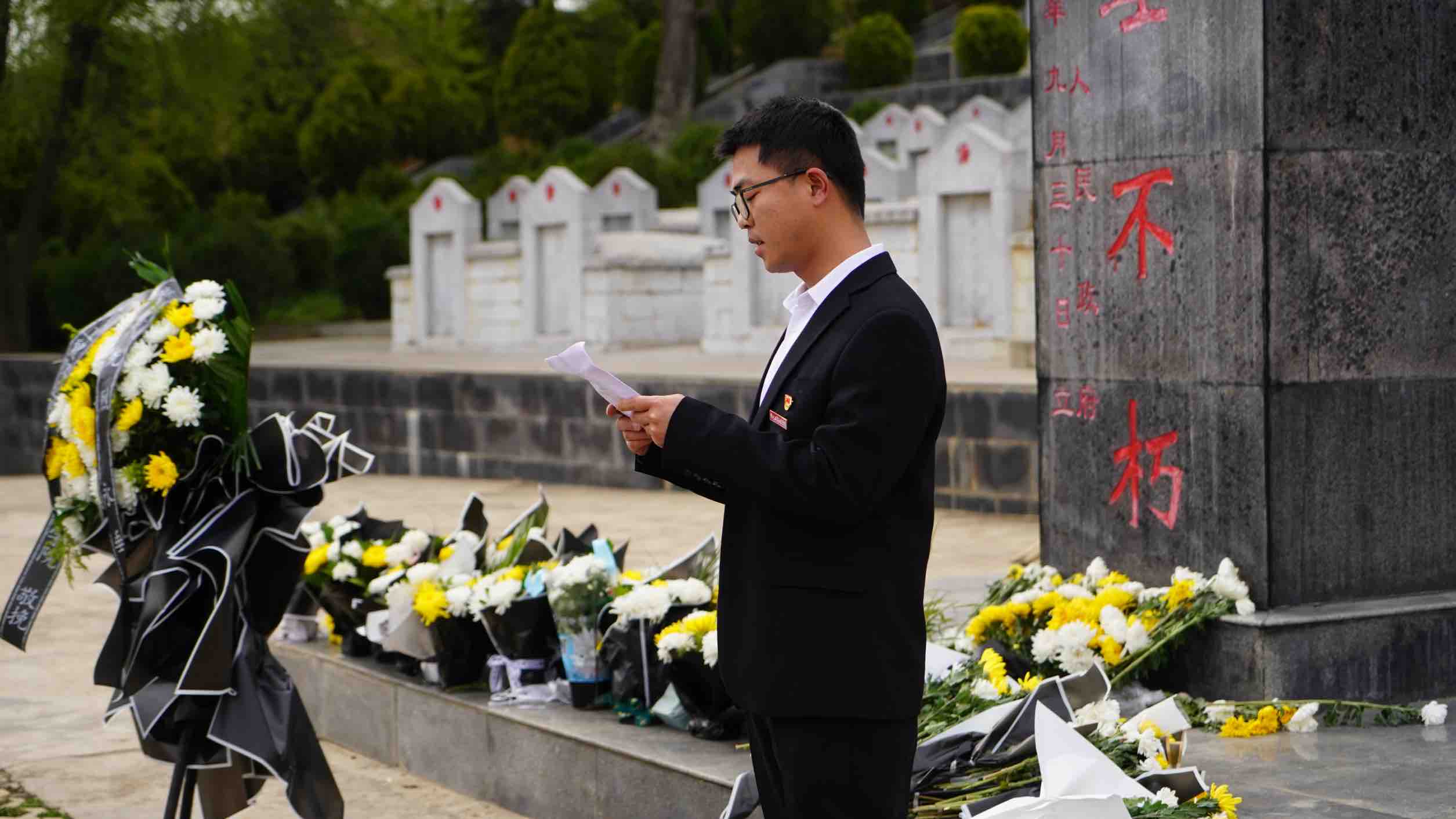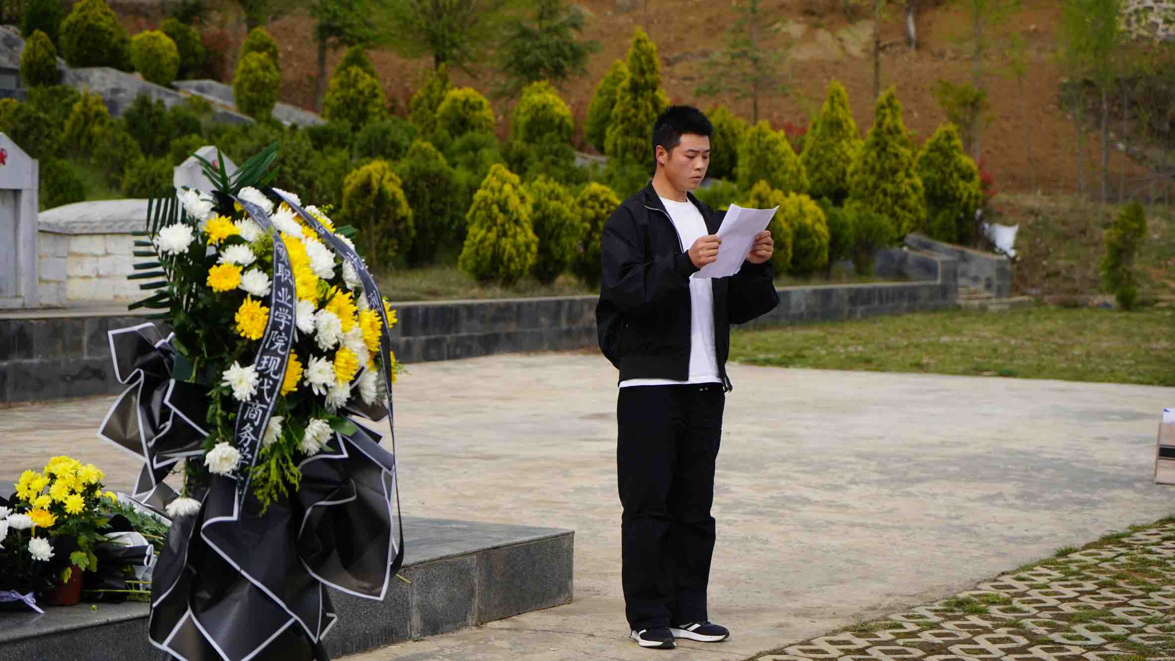 学生党员代表王令激昂献辞。身为退役军人的他,毅然选择重返校园,继续深造。这份经历让他对责任与担当有着更为深刻的理解。此刻,他站在陵园之中,话语掷地有声,他的言辞里,既有当代青年对先烈们共有的敬仰与追思,更因自身军旅生涯的磨砺,多了几分对往昔峥嵘岁月的深刻共情。
