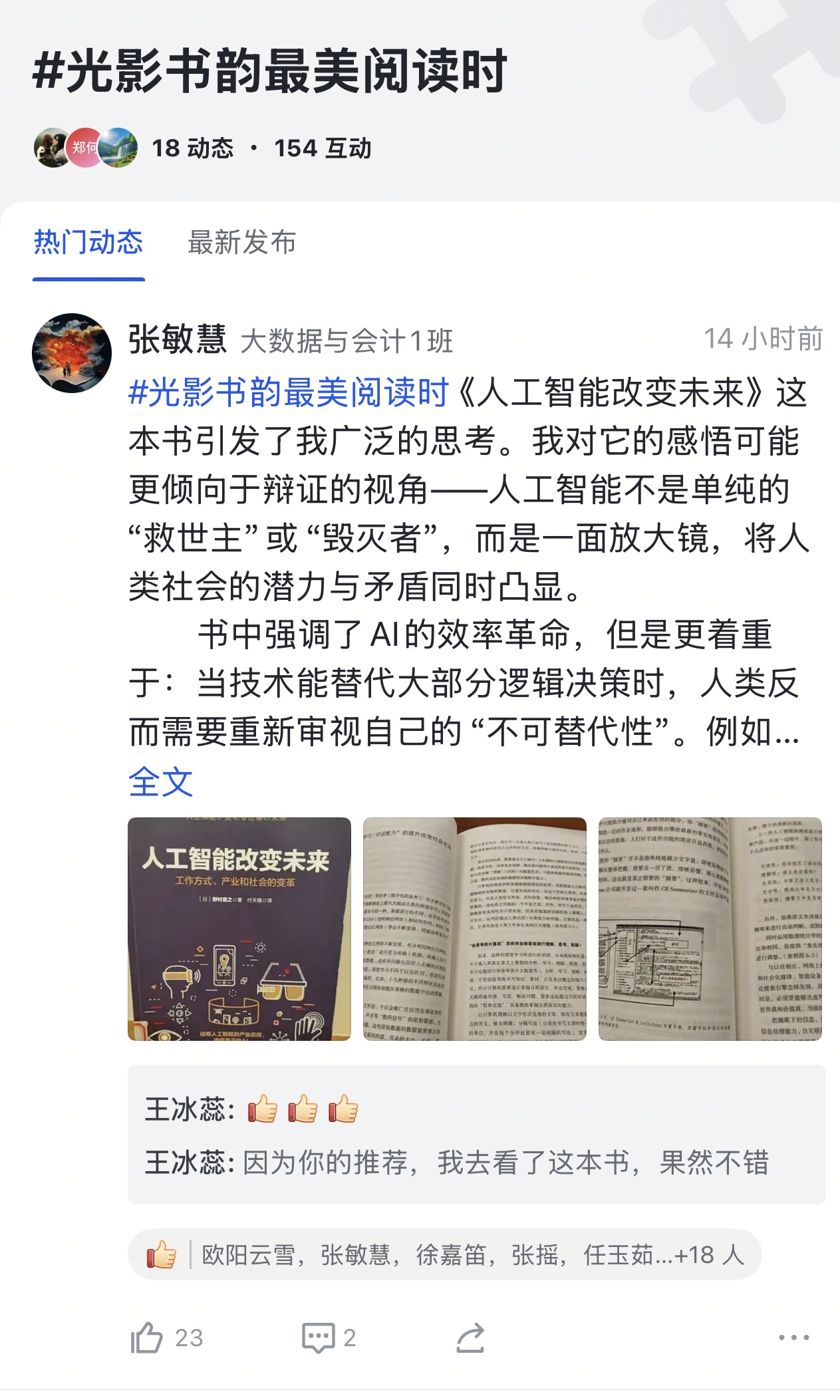 分享环节结束后的第二天,学院将综合内容的思想深度、表达流畅度、逻辑性以及互动效果等多方面因素,评选出点赞数量最高的三名优秀分享者,并为他们颁发“最美读者”荣誉证书。这一举措不仅是对积极参与阅读和分享行为的肯定与鼓励,更是搭建了一个促进思想碰撞、激发创新思维的平台。