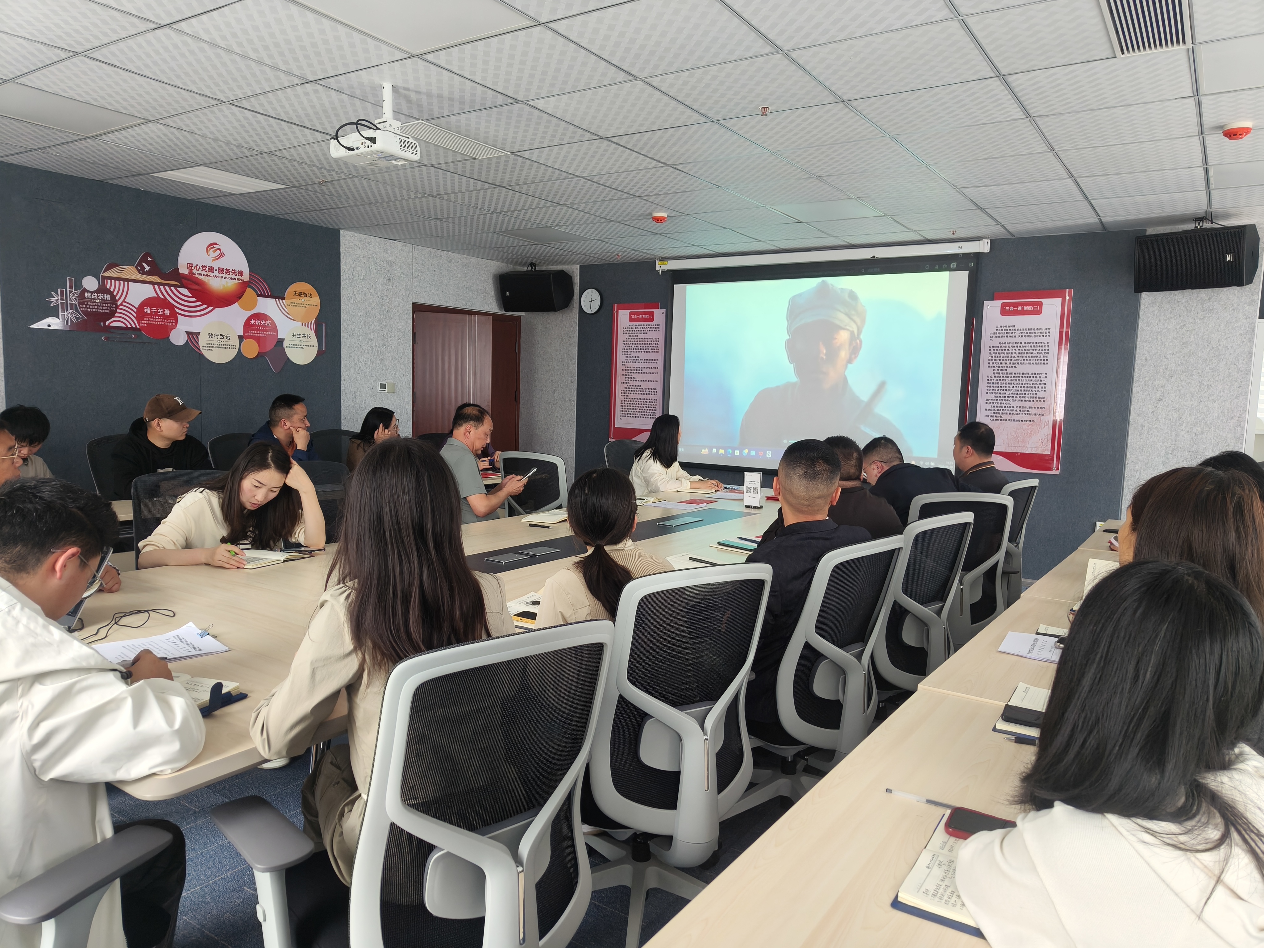 重温入党誓词仪式结束后,支部全体党员集中观看红色题材影片《血战湘江》。影片通过生动的艺术再现,生动地展现了中国共产党在革命时期艰苦卓绝的奋斗历程,深刻诠释了革命先辈们坚定的理想信念和无私奉献的精神。