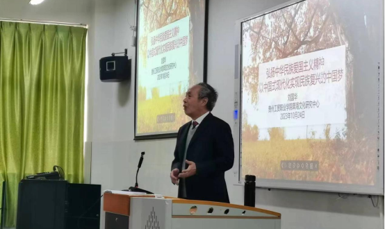 为了推进新时代大学生爱国主义教育,弘扬先辈的红色理念文化,学生塑造积极向上的人生观。草海文化研究中心于10月24日在3号教学楼北区第一阶梯教室为乡村振兴产业学院(现代商务学院)学生开展了“弘扬中华民族爱国主义精神,以中国式现代化实现民族复兴的中国梦”的讲座。本次讲座由草海文化研究中心首席专家刘国华教授主讲,出席本次讲座的有草海文化研究中心部分成员、马克思主义学院全体教师,乡村振兴产业学院学生会全体成员、各班学生干部、23级电子商务专业全体学生。