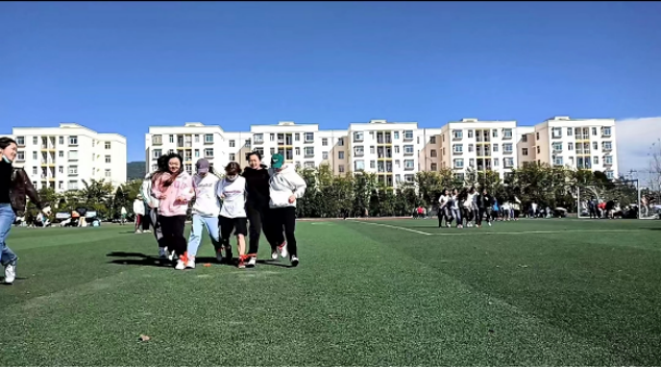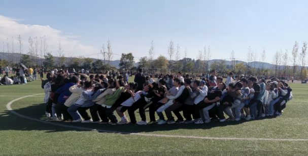 众人拾柴火焰高众人植树树成林同学们侧身围成一圈,向右转双手搭住前面一人的双肩要求所有人注意听一个口令(比如叫停就停,叫跳就跳,叫坐就坐叫坐时前一人要坐在后一人腿上,叫走就走)听到后必须按口令做,否则受罚在各个队伍激烈的竞赛中“万里长城”小游戏让同学们感受到了团结的力量他们的精彩表现也迎来了阵阵欢呼