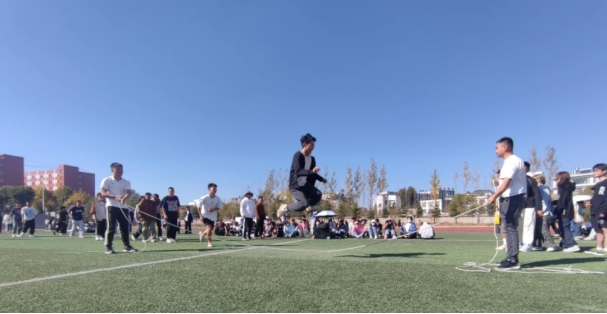 随着裁判的哨声响起场上长绳飞舞集体跳绳的队员们互相协作和舞动的长绳一起跳跃他们在团结一致的跳跃间以饱满的热情和敏捷的身姿在鼓劲加油声中顽强拼搏、奋力争先