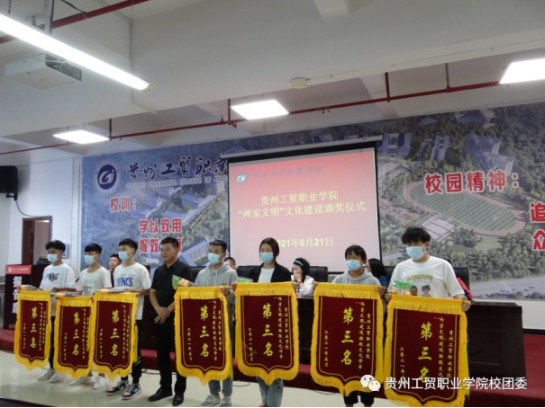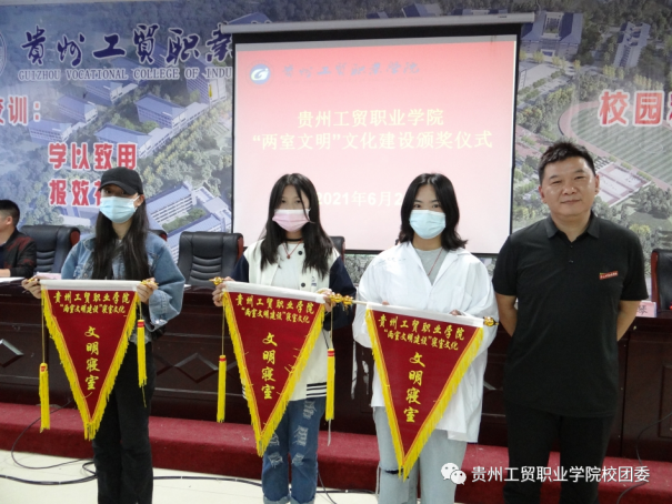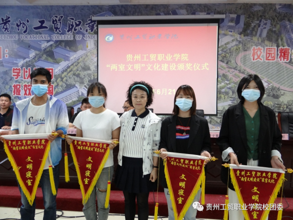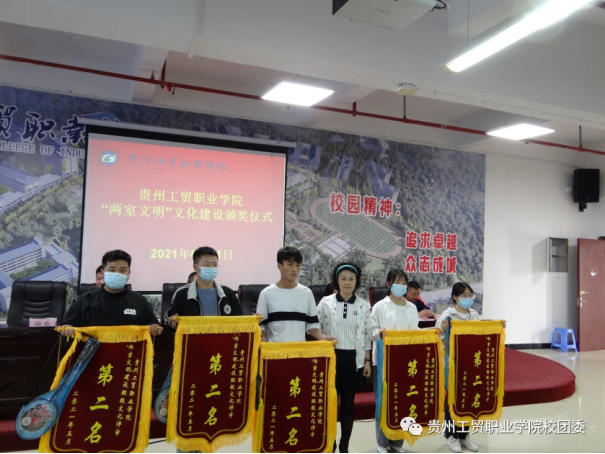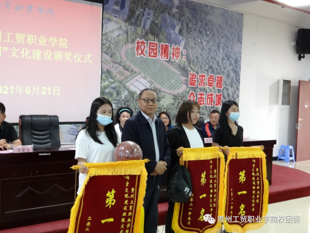 常务副校长黄文霞为“两室文明”寝室文化建设高职老生一等奖获得者,以及“两室文明”班级文化建设二等奖获得者代表颁奖。