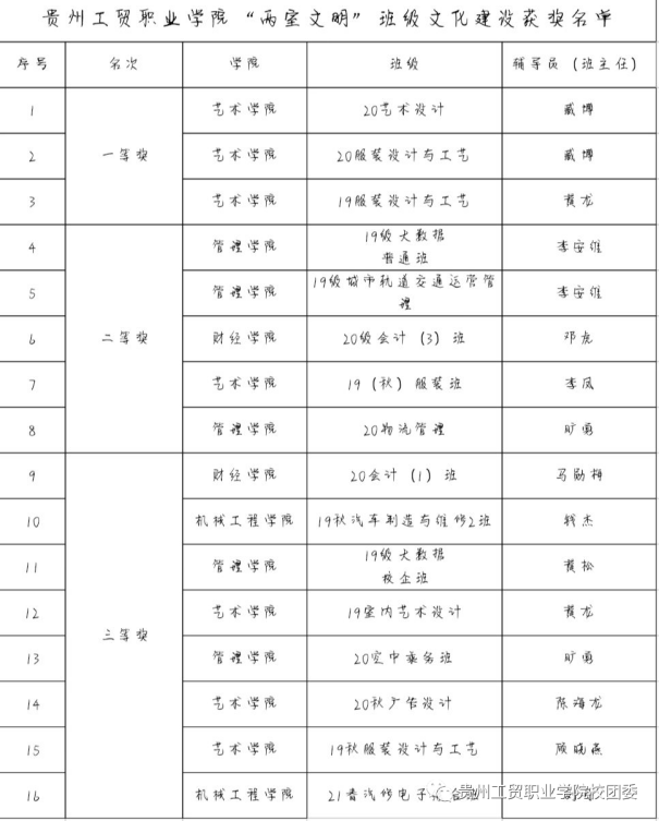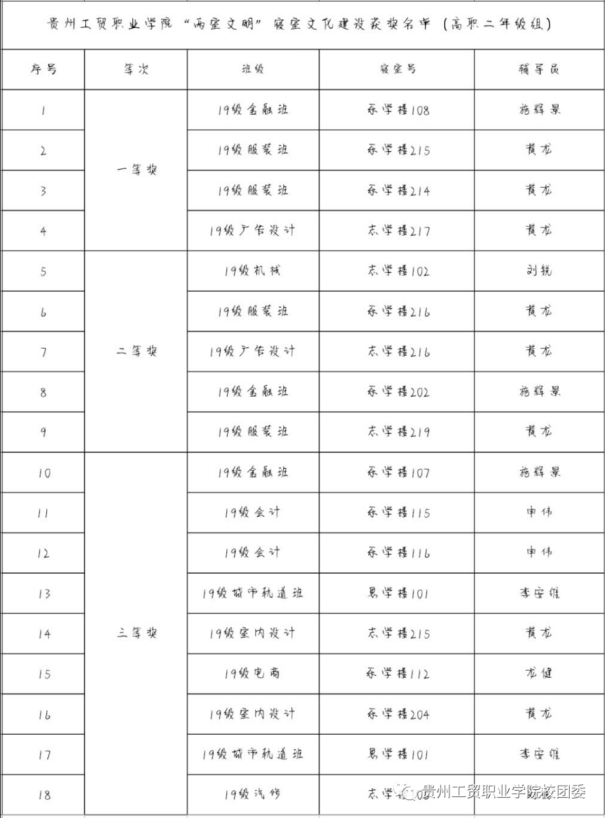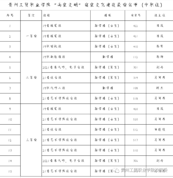 在校领导的大力支持下,全校师生共同参与,历时两个多月的“两室文明”文化建设活动终于在今天落下帷幕,本次活动共评选出班级文化建设一等奖3名、二等奖5名、三等奖8名;高职一年级组寝室文化建设一等奖6名、二等奖10名、三等奖14名;高职二年级寝室文化建设一等奖4名、二等奖5名、三等奖9名;中职组寝室文化建设一等奖3名、二等奖5名、三等奖7名。