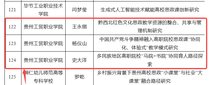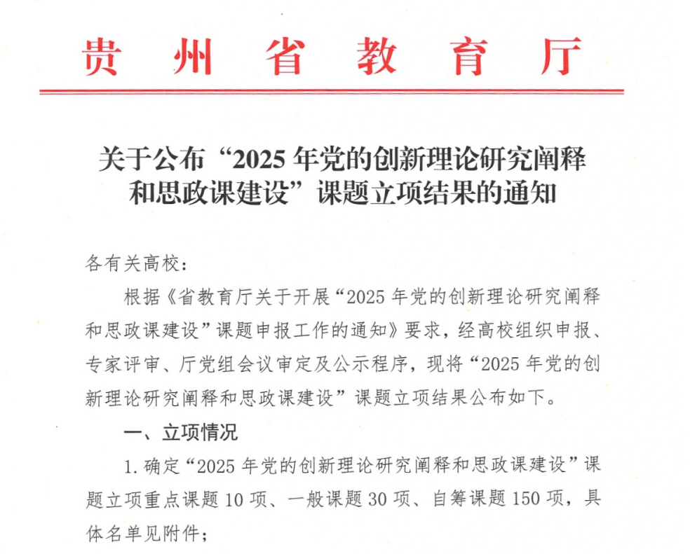 近日,贵州省教育厅正式公布2025年党的创新理论研究阐释和思政课建设课题立项结果。beat365官方网站申报4项,获自筹课题立项3项。这一喜讯充分体现beat365在党的创新理论研究阐释和思政课建设方面的扎实基础和科研实力,将为学校深化教育教学改革、推动高质量发展注入动力,助力学校在高质量考核与发展中再创佳绩。