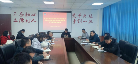 会上校长伍金虎传达学习全市教育系统安全生产专项整治三年行动“巩固提升”工作方案文件精神和要求:1.以习近平新时代中国特色社会主义思想为指导全面贯彻党的十九大和十九届历次全会精神,深入贯彻习近平总书记关于安全生产重要论述和批示。2.坚持党的领导、坚持以人民为中心、坚持分类管理、坚持预防为主、坚持“五个治理。3.通过开展三年专项整治行动“巩固提升”工作,切实解决思想认识不足、安全发展理念不牢、落实存在差距等突出问题。4.强化专题学习成效;一是深入学习习近平总书记关于安全生产重要论述及视察贵州、毕节重要讲话精神和国务院、省、市安全生产电视会议的精神,巩固学习成效,提升行动自觉。二是组织对“生命重于泰山--学习习近平总书记关于安全生产重要论述”电视专题片进行再学习。5.夯实校园基础设施;一是持续推进校园安全基础能力建设;二是保障校内建筑安全,对校舍、围墙、校门、厕所等附属设施是否存在固定不牢、墙体开裂、地质灾害等隐患展开全面排查并及时整治。6.关爱学生健康成长;一是关注学生心理健康,健全完善学生心理健康教育、排查、干预工作机制。二是加强对特殊群体学生重点管理。7.加强校园内部安全管理;一是加强学校消防安全管理。二是预防校园欺凌。三是加强教职员工管理。四是治理校园电信诈骗、校园贷。五是预防校园食品安全。六是严把意识形态安全关口,开展排查整治。8.校园周边环境整治;一是发挥学校“三防”建设功能。二是要加强学生交通安全管理。