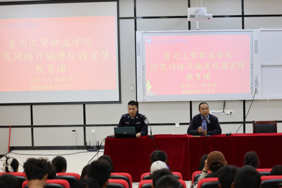 威宁县公安局反诈中心民警林登辉主讲,学工处、保卫处工作人员,各学院学工科长、辅导员及各班部分学生300余人参加。此次宣传教育活动由保卫处副处长马永全主持。