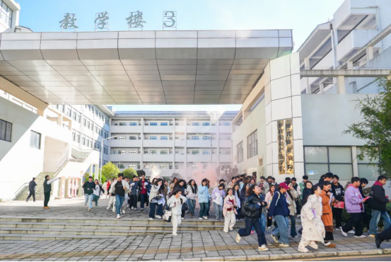 演练以应急广播和哨声为信号,各班级辅导员立即组织学生用湿毛巾捂住口鼻,弯腰低姿沿预定路线有序撤离。全体参与师生安全、快速抵达指定集合点,整个疏散过程紧张有序、规范高效,达到预期效果。