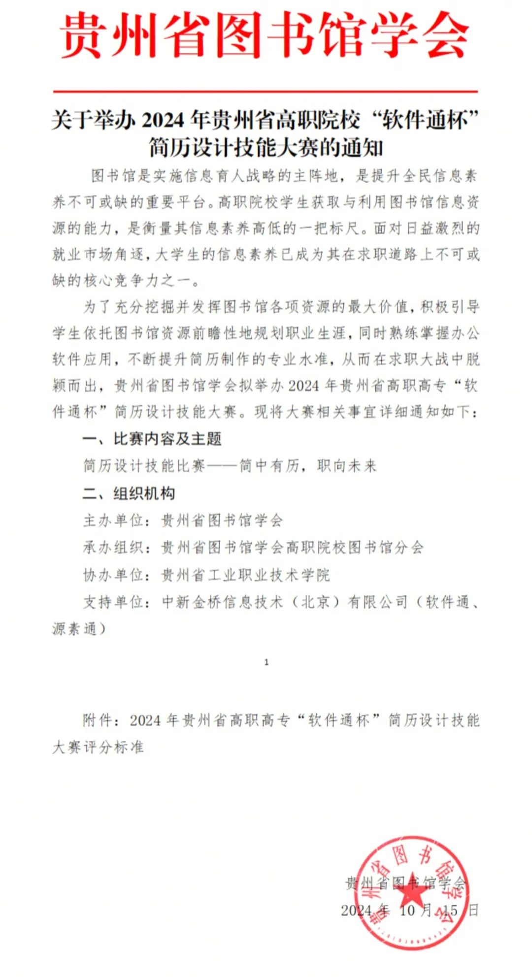 12月20日,受瞩目的 2024 年贵州省高职高专“软件通杯”简历设计技能大赛圆满落下帷幕。此次大赛由贵州省图书馆学会主办,其高职院校图书馆分会负责承办,贵州省工业职业技术学院倾力协办,同时得到了中新金桥信...
