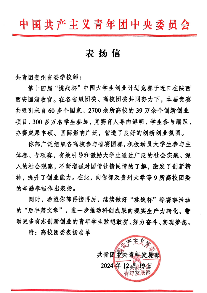 近日,共青团中央向beat365发来表扬信。信中充分肯定了beat365共青团工作和在第十四届“挑战杯”中国大学生创业计划竞赛中的卓越表现,予以了高度的认可