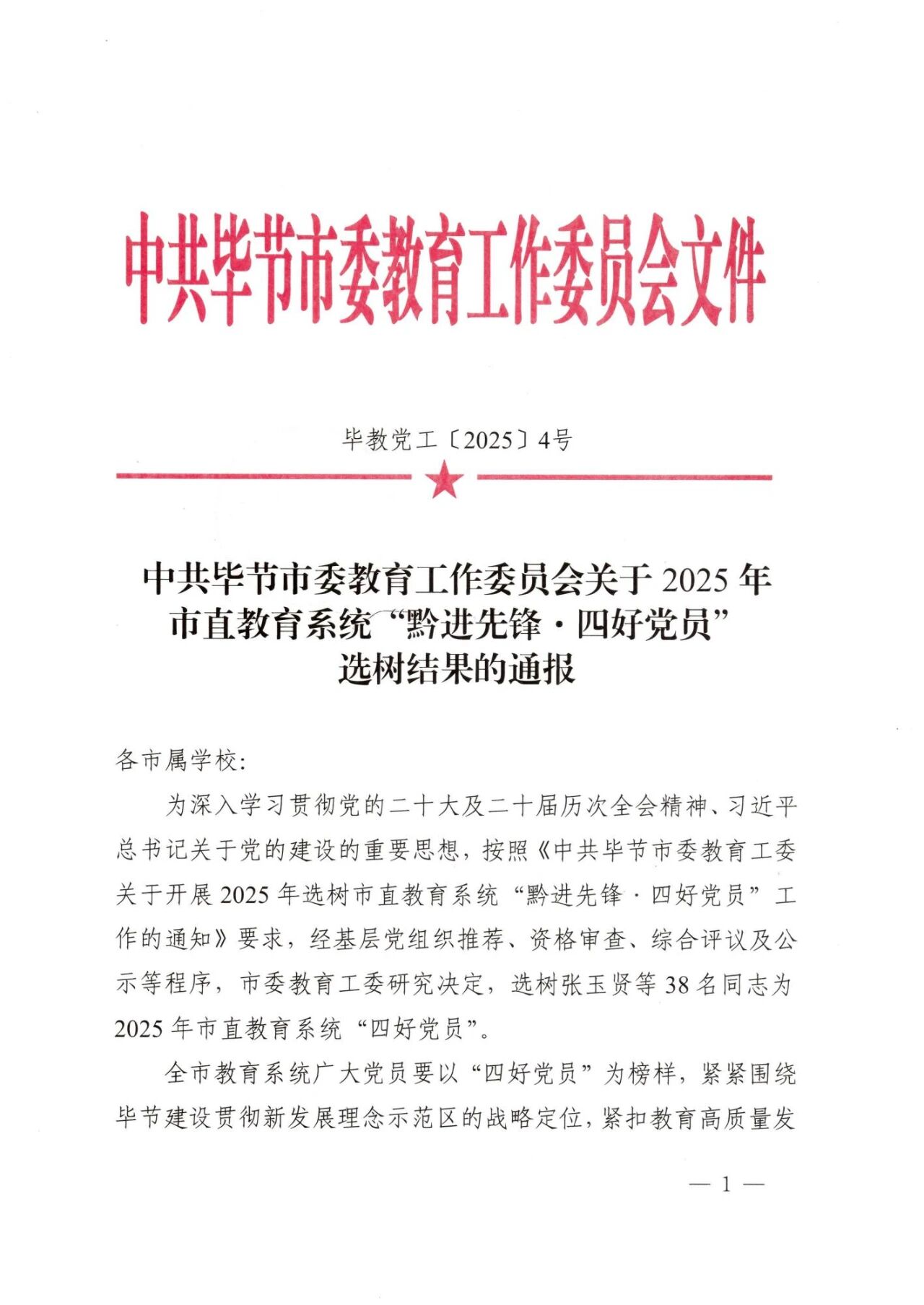 近日,中共毕节市委教育工委关于2025年市直教育系统“黔进先锋·四好党员”选树结果通报的文件中,beat365官方网站张功杰、朱丽娟、马学刚3名教师荣获“黔进先锋·四好党员”荣誉称号。